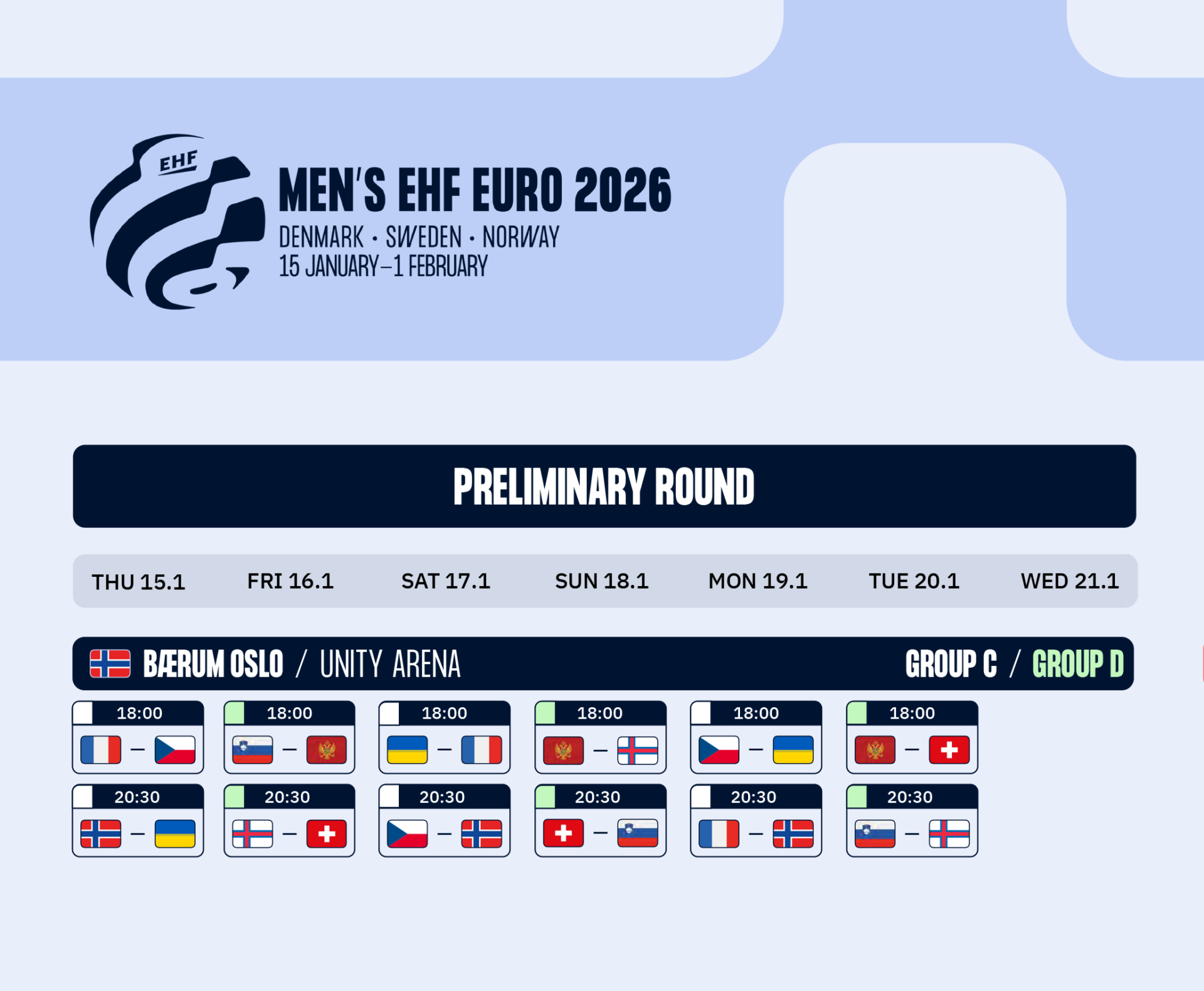 Norge vil spille sine innledende kamper i Gruppe C i Unity Arena; 15, 17 og 19 januar. Lag som er i Gruppe D vil spille sine kamper i Unity Arena; 16, 18 og 20 januar.